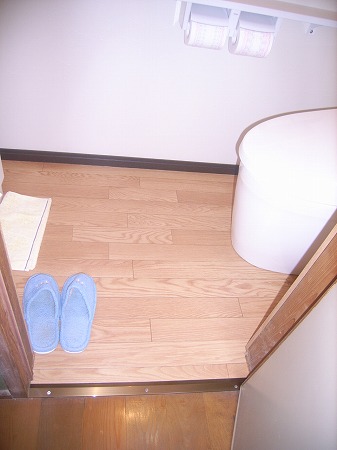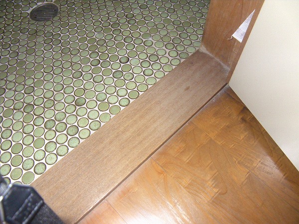 床タイルでお水を流して掃除が出来る仕様だったため、入口から水がもれないように わざと段差が付いていました。