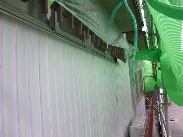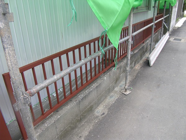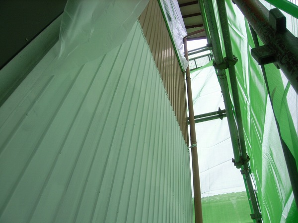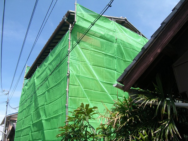 外壁は塗装範囲も広い為、ペンキの拡散防止の為に、足場とともに拡散防止シートを設置します。
