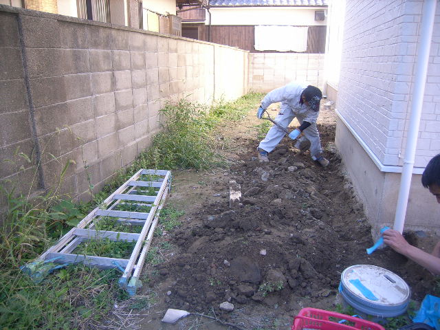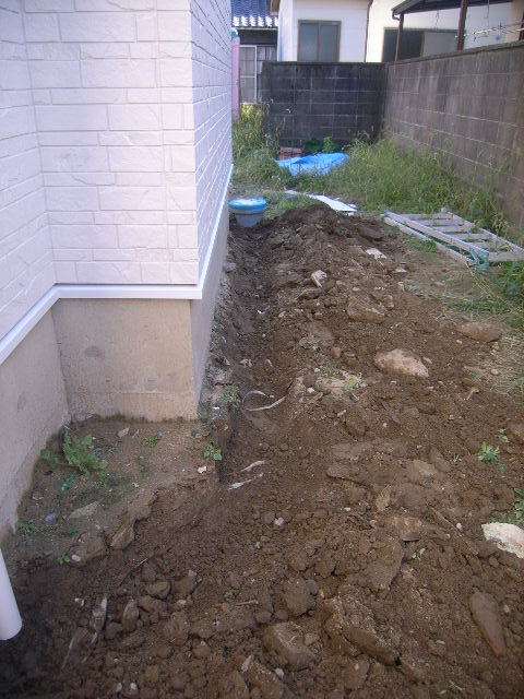 ここに(樋から桝に水を流すための)雨水管を埋める穴を掘ります ↓